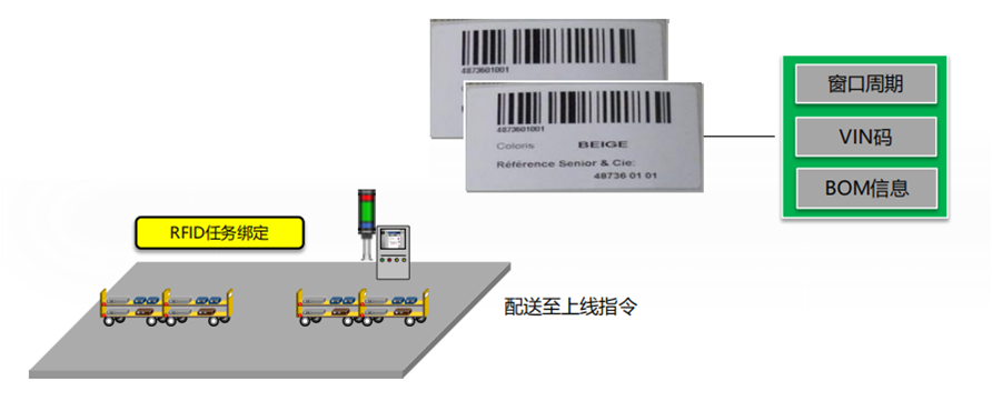步骤二:扫描AGC小车上拉的2辆小车车身的条码,扫描成功与否显示在看板显示器上。如果扫描成功,屏幕上大字号显示“XXXXXXXX 关联成功!” 。并自动把扫描条码写入到车身RFID标签上,三色指示灯亮起绿灯3s后,自动熄灭。如果扫描失败,屏幕上大字号显示“XXXXXXX关联失败!”三色指示灯亮起红灯3s后,自动熄灭。重新扫描,直至成功。至此,排序系统中的车型扫描到了PTL系统中记录。