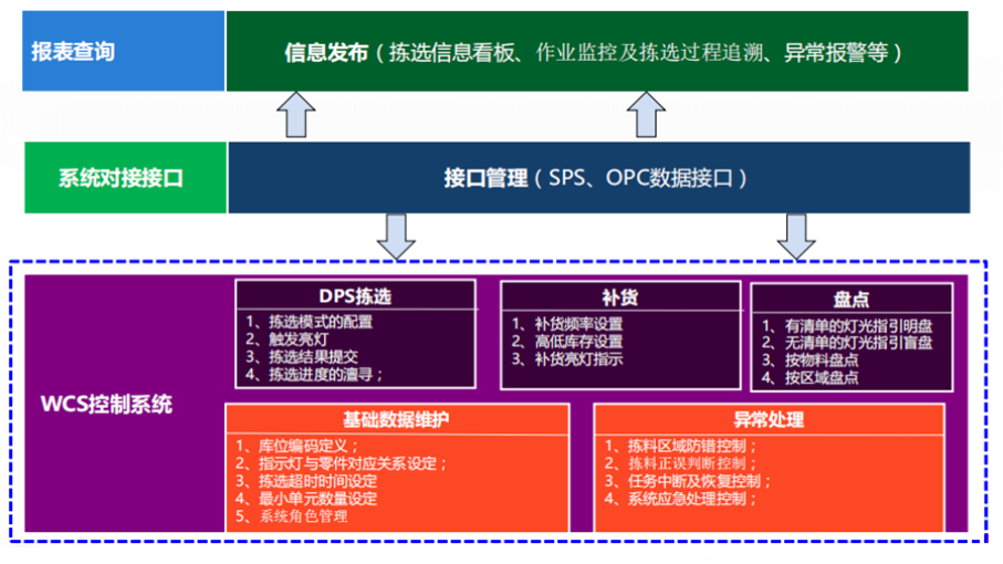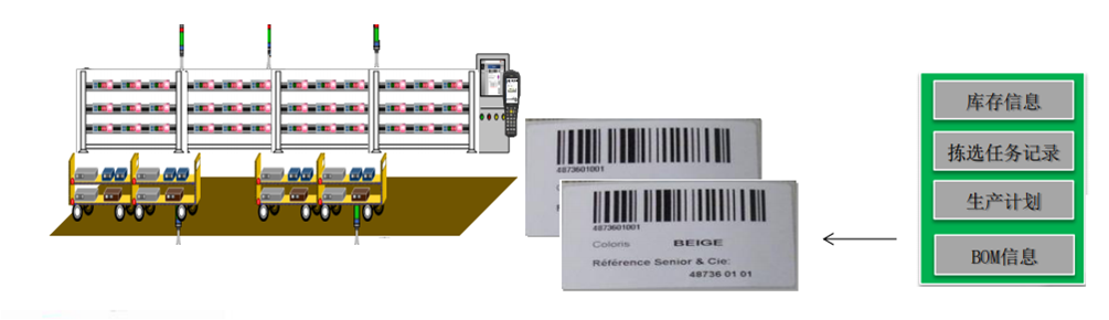 步骤一:小车进入停靠点后,自动触发感应拣选车上的RFID标签内容,并显示在订单显示器上。如果在当前工位2个小车都有拣选任务,三色灯将会亮起绿灯和黄灯。否则只会其一种颜色灯。步骤二:根据亮灯位置和指示数量,从对应位置上取出物料放入到拣选车上,当取出物料后,标签通过感应自动熄灭。如果手从错误的位置取出物料,当前错误位置的标签将会快速闪烁为红色,同时三色灯的红灯也快速闪烁。必须拍灭报警位置的红色闪烁标签后,方可以进入正确位置进行拣选。